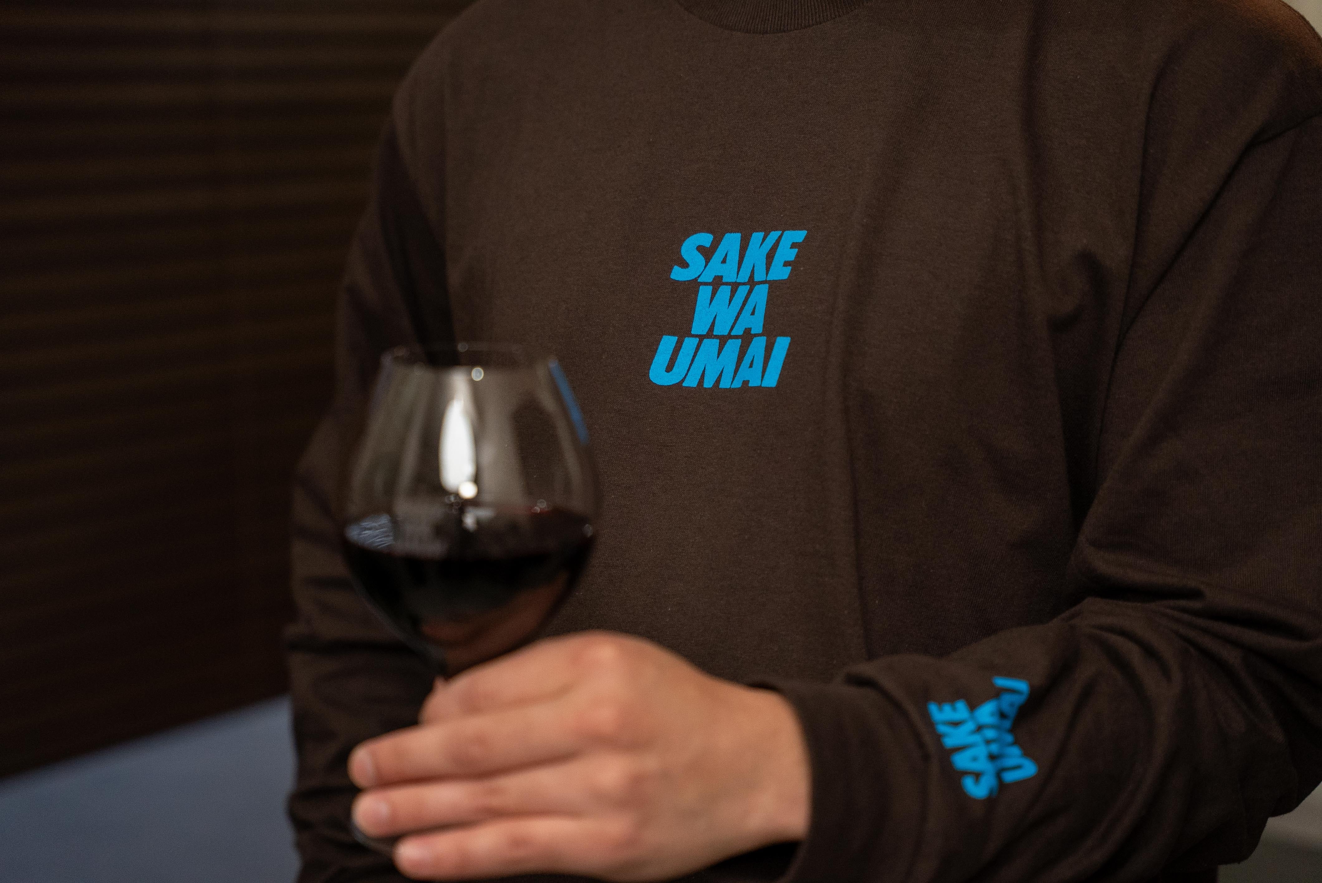 酒好きにはたまらないデザインで、胸元と右袖には「SAKE WA UMAI」と大胆にプリントされています。